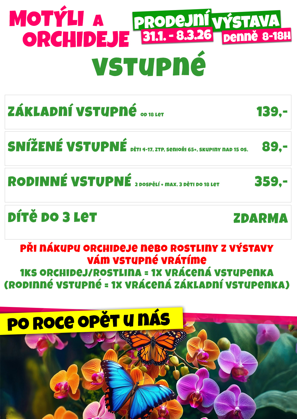 Nechte se unést do světa barev a vůní, kde stovky exotických motýlů poletují mezi nádhernými rozkvetlými orchidejemi. Zima už je dlouhá, tak si přijďte zpříjemnit zimní dny jedinečným zážitkem, který potěší nejen vás, ale i celou rodinu.